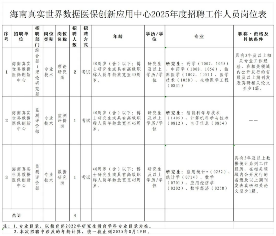 本次公开招聘事业编制专业技术人员共4名。具体详见《海南省医疗保障局2025年公开招聘事业编制工作人员职位表》(附件1)。