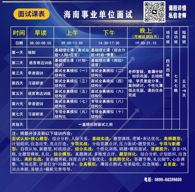 师资团队:部分讲师来自海南高校的教授、硕导,拥有丰富的高校及大型企业面试实战经验。他们深入研究面试理论与技巧,尤其是“互动式结构化面试”“复杂环境面试训练”以及“专岗专训”,能够为考生提供系统、专业的指导。